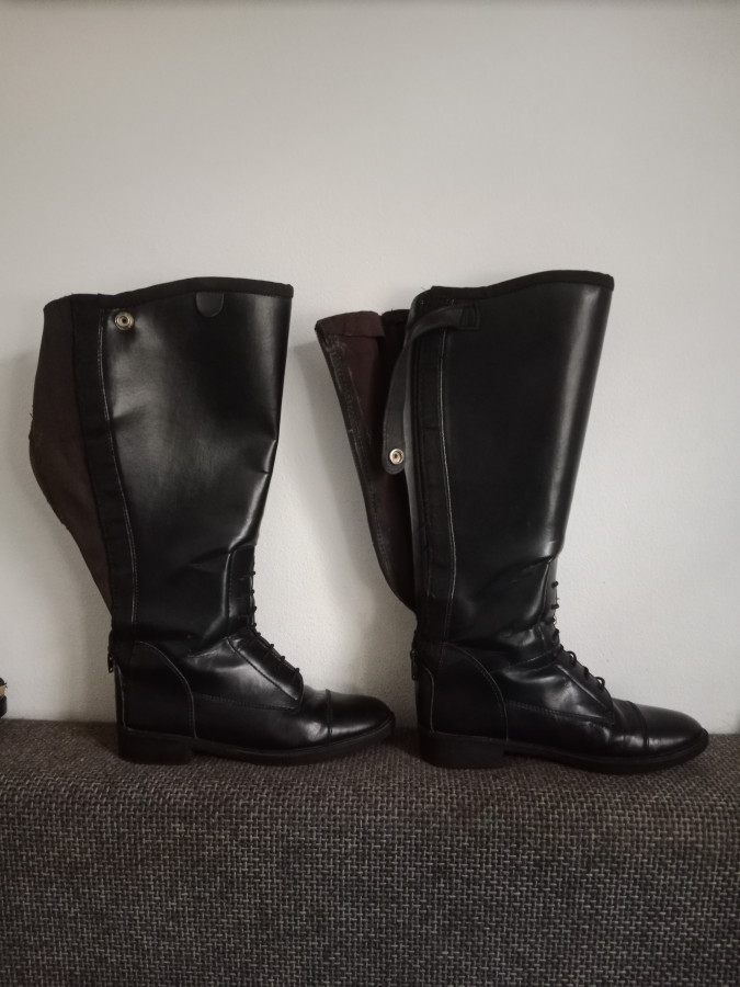 Po zakupie były dopasowywane przez szewca - zostały skrócone na wysokość i poszerzone, wstawiona guma w kolorze brązowym.