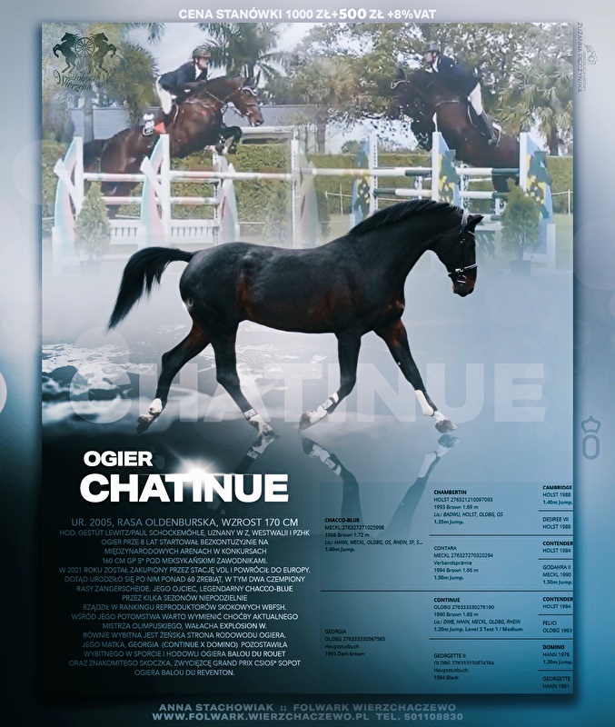 Syn wybitnego Chacco Blue z matki po Continue. Wzrost 170 cm. Uznany w Zangersheide i PZHK.