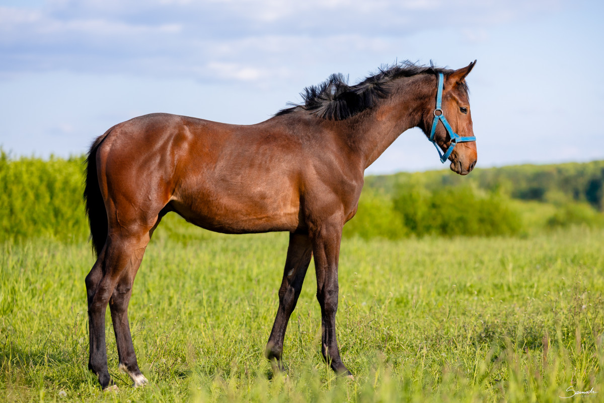 Dobrze zapowiadający się młody ogier. Poprawny w budowie, lekki w ruchu, z przyjaznym charakterem. Przewidywany wzrost powyżej 170 cm.
