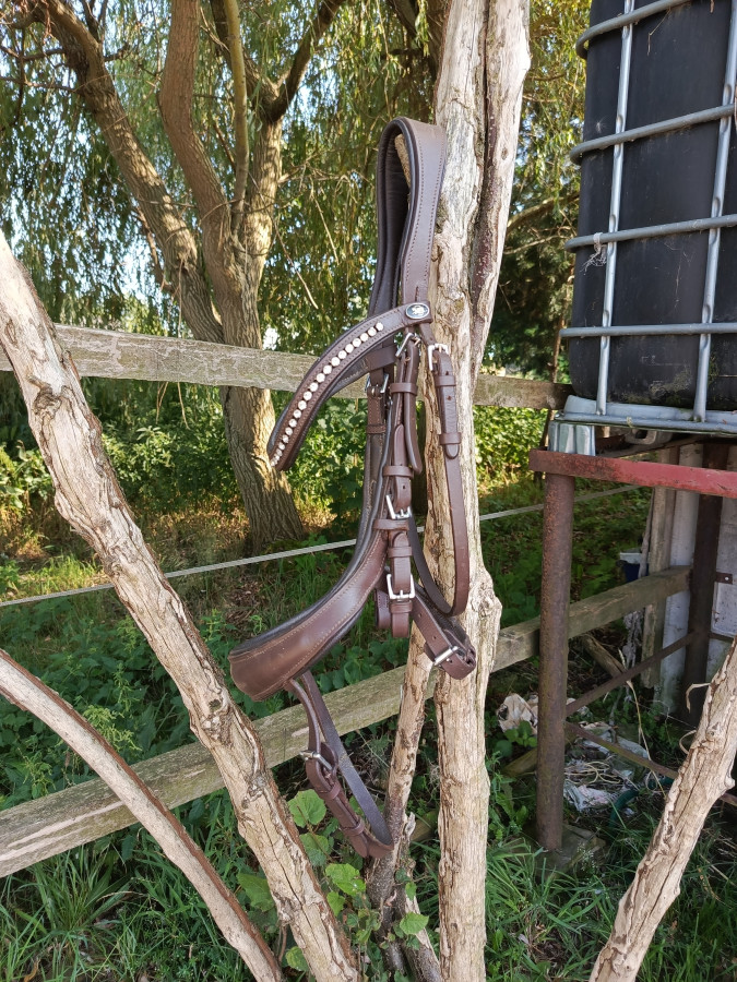 Ogłowie w kolorze brązowym firma Balotade model Andiamo rozmiar Cob. Stan bardzo dobry, wszystkie cyrkonie w naczółku są. Super anatomiczne ogłowie. Zapraszam do innych moich ogłoszeń sporo sprzętu na sprzedaż.