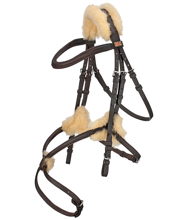 Ogłowie wyściełane prawdziwą jagnięcą skórą z meksykańskim nachrapnikiem i anatomicznym trójkątnym wzorem bez irytujących pierścieni bocznych. Wykonane z misternie przetworzonej miękkiej skóry, dzięki czemu jest wyjątkowo miękkie i wyjątkowo przytulne. Wszystkie elementy skórzane są wykonane ze skóry, która była wielokrotnie olejowana i ma przyjemnie miękką jakość. Prosta część głowy i 3 węzły na nachrapniku są miękko wyściełane mocno przyszytą skórą jagnięcą i dlatego są idealne dla wrażliwych głów koni. Okucia w kolorze srebrnym. Bez wędzidła i wodzy.