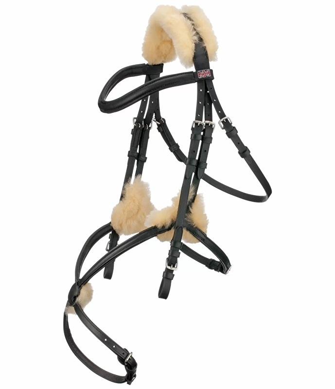 Ogłowie wyściełane prawdziwą jagnięcą skórą z meksykańskim nachrapnikiem i anatomicznym trójkątnym wzorem bez irytujących pierścieni bocznych. Wykonane z misternie przetworzonej miękkiej skóry, dzięki czemu jest wyjątkowo miękkie i wyjątkowo przytulne. Wszystkie elementy skórzane są wykonane ze skóry, która była wielokrotnie olejowana i ma przyjemnie miękką jakość. Prosta część głowy i 3 węzły na nachrapniku są miękko wyściełane mocno przyszytą skórą jagnięcą i dlatego są idealne dla wrażliwych głów koni. Okucia w kolorze srebrnym. Bez wędzidła i wodzy.