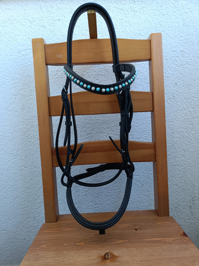 Dzień dobry, sprzedam czarne BARDZO ŁADNE skórzane ogłowie. Ogłowie w rozmiarze COB w stanie bardzo dobrym. Skóra miękka i elastyczna. Ozdobny naczółek zdobiony rzędem perełek, żadnej NIE BRAKUJE. Nachrapnik z miękkim podszyciem. Paski wędzidłowe zapinane na wygodne haczyki.