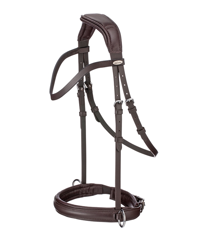 delikatne, anatomicznie wycięte, bezwędzieniowe ogłowie z dwoma oczkami z boku nachrapnika do mocowania wodzy. Umożliwiają one równomierne rozłożenie nacisku podczas oddziaływania na kość nosową i delikatne wspomaganie. Anatomiczny nagłówek i wyjątkowo miękka wyściółka z prawdziwej skóry na nachrapniku. Okucia w kolorze srebrnym. Bez wodzy.