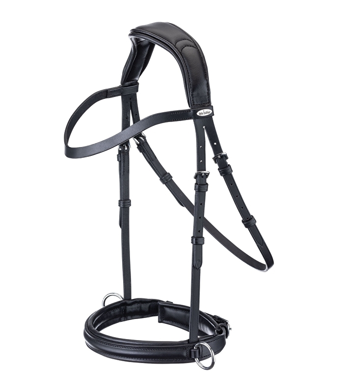 delikatne, anatomicznie wycięte, bezwędzieniowe ogłowie z dwoma oczkami z boku nachrapnika do mocowania wodzy. Umożliwiają one równomierne rozłożenie nacisku podczas oddziaływania na kość nosową i delikatne wspomaganie. Anatomiczny nagłówek i wyjątkowo miękka wyściółka z prawdziwej skóry na nachrapniku. Okucia w kolorze srebrnym. Bez wodzy.