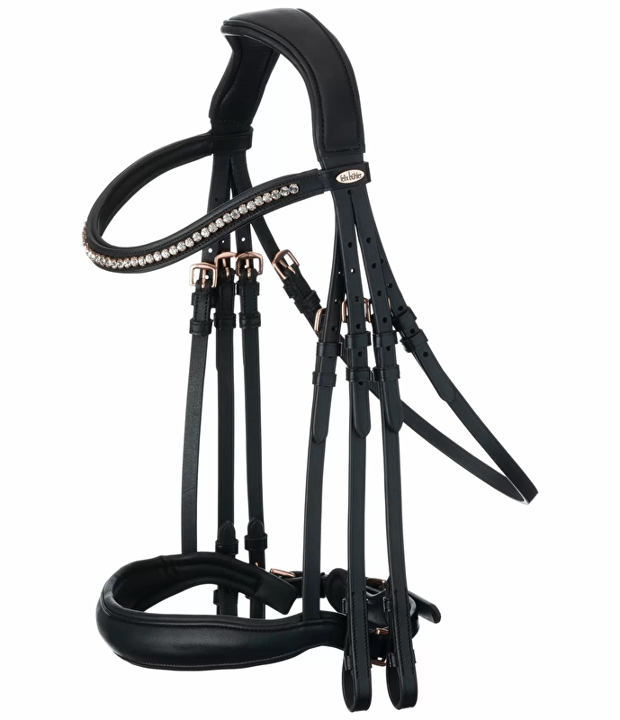 Ogłowie wykonane z wysokiej jakości olejowanej skóry premium z anatomicznym, szwedzkim nachrapnikiem, który dzięki swemu krojowi zapewnia więcej miejsca na wędzidło. Szyja i nachrapniki wykonane są w całości z miękkiej skóry. Ta starannie przetworzona skóra jest szczególnie miękka i elastyczna oraz zapewnia optymalny rozkład nacisku i ulgę w obszarze uszu, pierwszego kręgu szyjnego i grzbietu nosa. Miękko wyściełana poduszka pod brodą i zakrzywiony naczółek ozdobione efektownymi białymi kryształkami. Pętle krawężnikowe i wędzidłowe oraz wodze krawężnikowe wyposażone są w ukryte, wewnętrzne haczyki do ogłowia. Zawiera kompletne skórzane wodze, bez wędzideł.