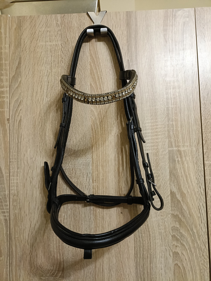 Dzień dobry, sprzedam ogłowie w rozmiarze FULL w kolorze czarnym. Ogłowie w bardzo dobrym stanie, skóra miękka i elastyczna. Przepiękny zdobiony naczółek, wszystkie kryształki na miejscu. Prezentuje się pięknie.