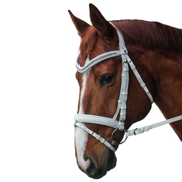 W sprzedaży piękne, skórzane ogłowie w kolorze białym. Posiada szeroki natylnik (pasek potyliczny), anatomiczny, profilowany. Dodatkową zaletą jest profilowany, zdobiony naczółek, podszyty miękką skórą, wykończony małymi kamieniami. Okucia ogłowia są w kolorze srebrnym, zapięcia klasyczne. Nachrapnik angielski, szeroki, miękki, ze skośnikiem. W komplecie nie ma wodzy.