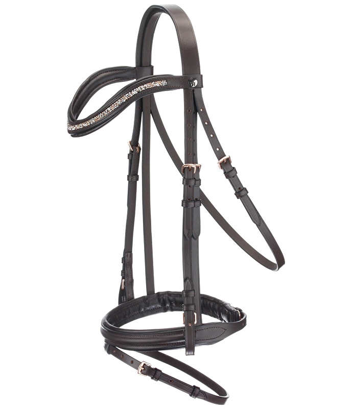 Ogłowie z angielskim nachrapnikiem oraz z błyszczącym profilowanym naczółkiem, który jest wysadzany drobnymi kamyczkami w kolorze różowego złota i srebra. Naczółek nachrapnik wyłożone miękką skórzaną wyściółką. Okucia w kolorze różowego złota.