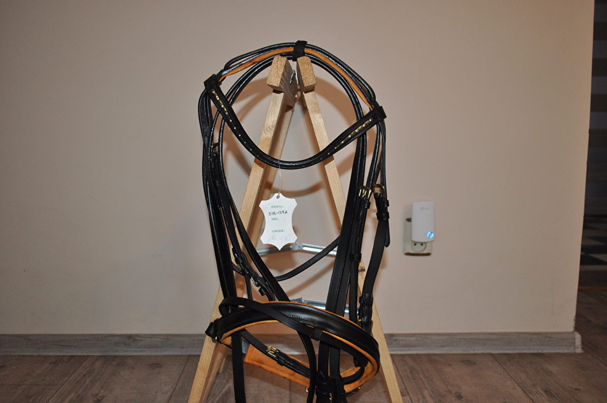 Ogłowie w kolorze czarnym, z lekko profilowanym naczółkiem, zdobionym małymi białymi kamyczkami i złotymi blaszkami. Pasek potyliczny i nachrapnik posiadają miękkie skórzane podszycie, zapewniając większy komfort użytkowania. Nachrapnik szwedzki, jest wyjmowany, można z niego zrezygnować. W komplecie z ogłowiem są nowe, skórzano-parciane wodze. Użyty do wykonania ogłowia materiał jest wysokiej jakości. Sprzączki są złote, klasyczne.