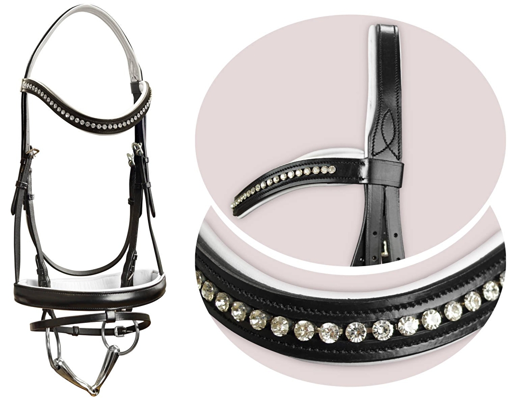 posiada opadający naczółek ozdobiony kryształkami oraz nachrapnik typu szwedzkiego