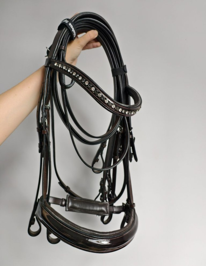 Eleganckie, miękkie ogłowie wykonane z roślinnie garbowanej skóry bawolej, zlakierowanym nachrapnikiem i naczółkiem z białymi i szarymi cyrkoniami. Nachrapnik ma szerokość 40 mm, a podszewka ma 7 mm grubości. Naczółek i nachrapnik mają ergonomiczny kształt dla większego komfortu. Sprzedawane z dwiema parami gładkich skórzanych wodzy o szerokości 12 mm i 15 mm. Okucia ze stali nierdzewnej.