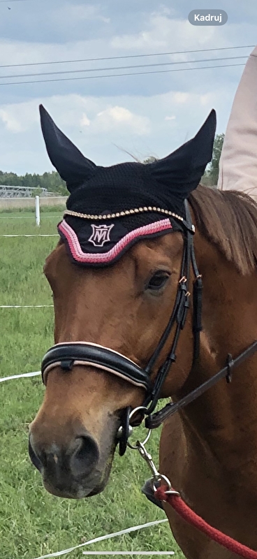 Eleganckie ogłowie z serii X-Line marki Waldhausen, wykonane z najwyższej jakości skóry, obustronnie regulowany pasek podgardla, nachrapnik angielski kombinowany, z szerokim i miękkim podszyciem nadającym mu elegancki wygląd, naczółek anatomiczny, zdobiony różowymi kamyczkami, sprzączki wykonane ze stali nierdzewnej w kolorze różowego złota, w komplecie z wodzami parcianymi o szerokości 19 mm - cena nowego 450 zł.