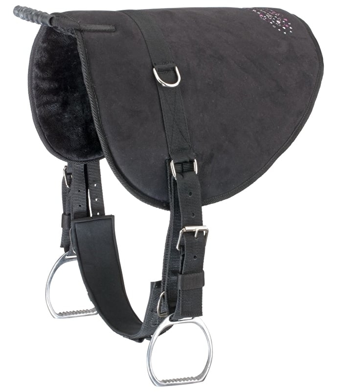 Praktyczny pad jeździecki dla dzieci z uroczym haftem. Wierzchnia część podkładki jest pokryta antypoślizgową zamszową skórą syntetyczną, spód wyściełany jest miękkim pluszowym polarem, co oznacza, że nie jest wymagany dodatkowy czaprak. Wyposażony w strzemiona (szerokość stopnia strzemienia 7,5 cm) i popręg (długość obwodu 40 cm). Dodatkowy pierścień do zapinania wodzy pomocniczej lub do zapinania skórzanych strzemion. Można również łączyć z innymi uprzężami i strzemionami.
