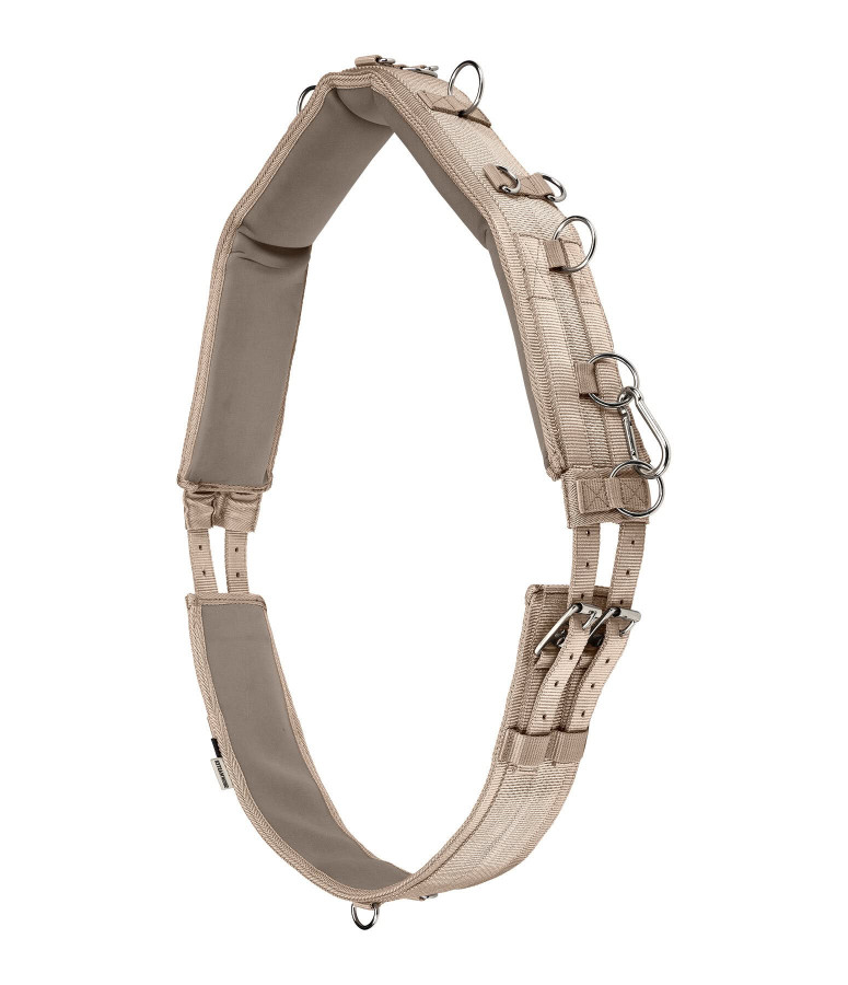 Bardzo wygodny pas do lonżowania. Bardzo miękka wyściółka pozwala na maksymalną swobodę ruchów, a tym samym na optymalną budowę mięśni. 16 kółek umożliwia różnorodne możliwości mocowania dodatkowych wodzy. Haki wspinaczkowe zapobiegają zgubieniu najniższych, ruchomych pierścieni. Solidne okucia w kolorze srebrnym. Obwód talii regulowany.