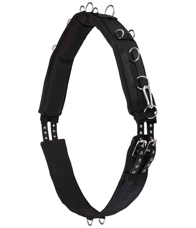 Wyjątkowo wygodny pas do lonżowania. Bardzo miękkie podszycie zapewnia największą możliwą swobodę ruchów, a tym samym optymalną pracę mięśni. 16 pierścieni zapewnia szeroki zakres opcji zapinania wodzy pomocniczych. Karabińczyki zapobiegają zgubieniu najniższych, ruchomych kółek. Stabilne okucia w kolorze srebrnym. Regulowany obwód w pasie. COB