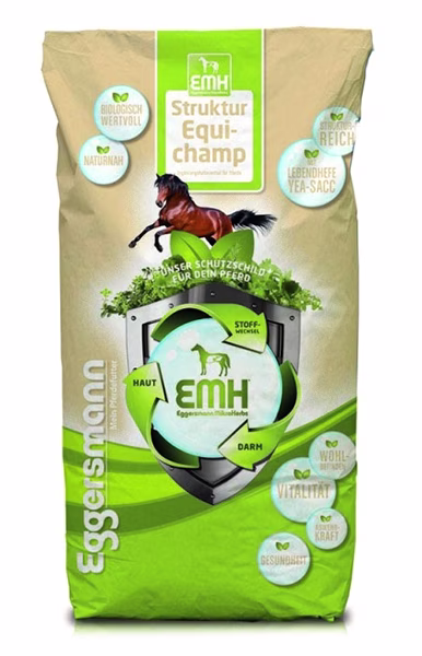 Drożdże są używane w ludzkim żywieniu od tysięcy lat. Skuteczność probiotyków została naukowo udowodniona. Szczególnie Saccharomyces cerevisiae są ważne z powodu dostarczania kompleksu witamin z grupy B. Niewiele osób wie, że drożdże zawierają nie tylko 20 aminokwasów, które odpowiadają między innymi za prawidłową kondycję układu mięśniowego, ale też zawierają pierwiastki śladowe. Żywe drożdże Yea-Sacc ® 1026 wspierają biotyczne trawienie w żołądku i jelicie grubym. Dzięki temu substancje odżywcze są łatwo dostępne, a poziom korzystnych bakterii jest zwiększony, co powoduje stabilizację poziomu pH. Obecność tych bakterii pozwala uniknąć nadmiernego zakwaszenia jelit. Przez dodanie drożdży do paszy, bakterie odpowiedzialne za trawienie włókna surowego są również wspierane. Nowe badania udowodniły, że dodanie żywych drożdży do paszy pobudza florę jelitową i prowadzi do lepszego wykorzystania ważnych składników odżywczych i minerałów. Źródła energii, jakimi są nasiona słonecznika, płatki kukurydzy i olej z ostropestu pobudzają metabolizm konia. Struktur Equichamp dostarcza wysokiej jakości składników, z naturalnymi witaminami, minerałami i nienasyconymi kwasami tłuszczowymi, które odgrywają ważną rolę w utrzymaniu twojego konia w zdrowiu. Naprawdę dobry efekt może zostać osiągnięty u koni z problemami z utrzymaniem masy (zbyt chudych). Drożdże prowadzą do optymalizacji dostępności substancji odżywczych, dzięki czemu pasza jest w pełni trawiona. Pozwala to uniknąć skarmiania dużych ilością paszy i podwójnie odciążyć układ pokarmowy - poprzez mniejsze porcje i przez pozytywne działanie drożdży. Konie osiągają prawidłową wagę równomiernie i szybko. Dużo naszych klientów używa Struktur Equichamp tylko w krótkich okresach - w okresach dodatkowej pracy lub stresu (na przykład w sezonie startów na zawodach), w typowych okresach występowania kolek w zimowych miesiącach, ale również jako profilaktykę zaburzeń jelitowych. Mieszanka powinna być skarmiana przynajmniej przez 6 tygodni, by osiągnąć optymalny skutek. Trwałe używanie Struktur Equichamp jest polecane dla koni, które mają tendencję do kolek. Doświadczalnie zostało sprawdzone, że również nerwowe konie stają się mniej pobudliwe, gdy są karmione Struktur Equichamp. Zadowoleni klienci informują nas, że ich konie są znacznie spokojniejsze. Przypisujemy to działanie ulepszonej dostępności składników odżywczych i obecności żywych kultur drożdży w paszy.