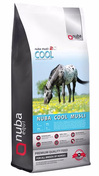 Musli stanowi niskoenergetyczną, bezowsową mieszankę przeznaczoną dla koni, które dobrze funkcjonują na paszy niskoenergetycznej lub dla koni nie pracujących. Będzie też doskonałym wyborem dla koni sportowych odstawionych czasowo od intensywnych treningów, gdzie zapotrzebowanie energetyczne jest dużo niższe niż zazwyczaj, ale nadal jest aktualna potrzeba dostarczenia składników odżywczych do utrzymania tkanki mięśniowej i całego organizmu w równowadze. Podwyższony poziom magnezu w Nuba Cool Musli sprawia, że konie bardzo dobrze znoszą okres rekonwalescencji, więc jest ono także odpowiednie dla koni kontuzjowanych, podczas leczenia czy przebywających w klinikach. Pasza stosowana zgodnie z zalecanym dawkowaniem nie wymaga dodatkowej suplementacji ogólnej. *