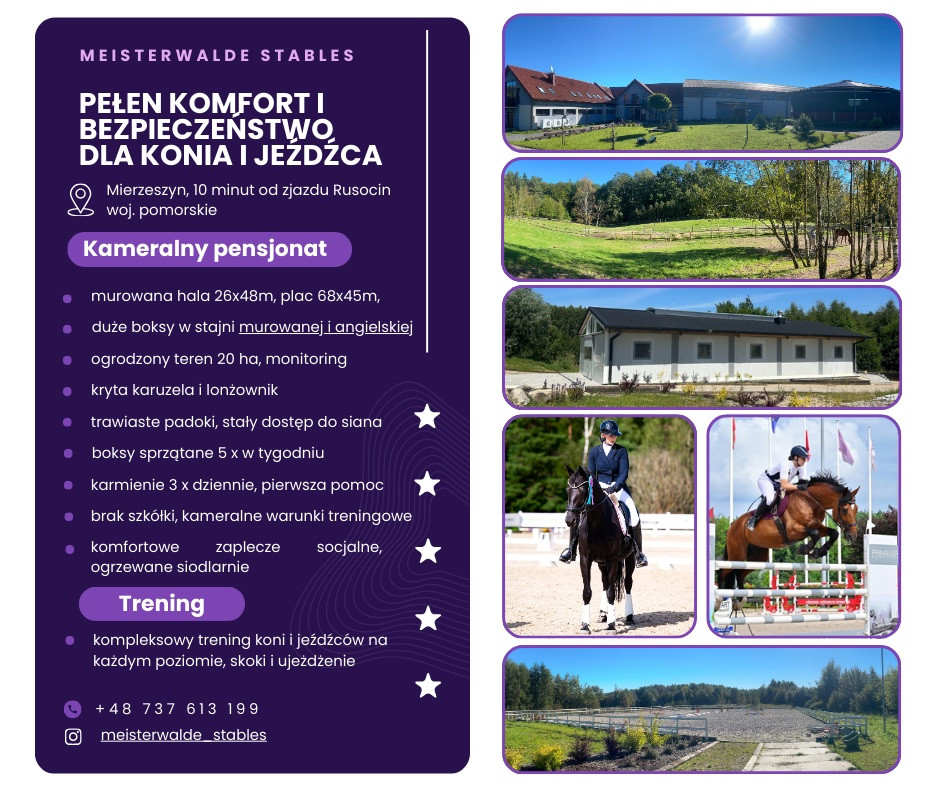 Jeden z najbardziej nowoczesnych ośrodków jeździeckich na Pomorzu. Pełne zaplecze sportowe. Bardzo kameralny ośrodek ogrodzony i monitorowany, bez dostępu dla obcych. Mierzeszyn, 10 minut od zjazdu Rusocin.