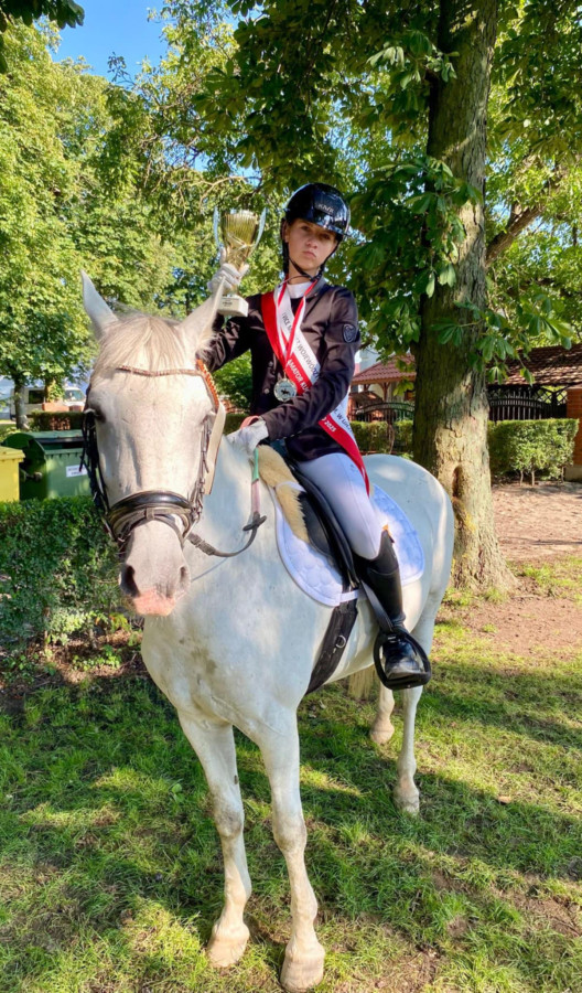 Ze względu na przesiadkę na dużego konia Blondyneczka poleca się do sprzedaży. Kucka 148 cm, certyfikat PZJ,9 lat, nie boi się niczego. Zdrowa, naskana do 100, wysokość jej nie straszna, I Vice Mistrzyni Województwa w ujeżdżeniu ( kat amator kuce) dwa sezony z rzędu, 5 kucyk w mistrzostwach województwa (finał 90 cm) w 2024, przy odpowiednim treningu masa się na D-bis, bezpieczna w obejściu, podczas zabiegów wet, w terenach, odczulona na bodźce. Nada się jako koń przesiadkowy z mniejszego kuca, ale również jako koń do ambitnej rekreacji. Klacz nie bryka,nie ponosi, nie ma narowów, ale czasem testuje jeźdźca i w jeździe po płaskim sprawdza prawidłowe użycie pomocy. Możliwość sprzedaży z całym dopasowanym sprzętem.