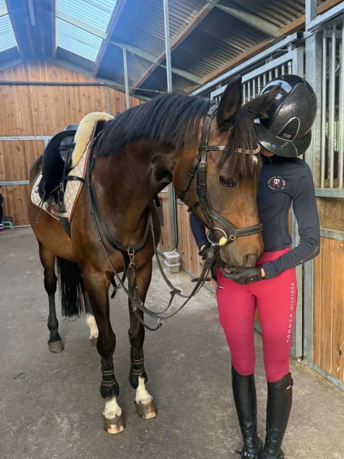 W regularnym treningu. Startowała w zawodach do 90cm.