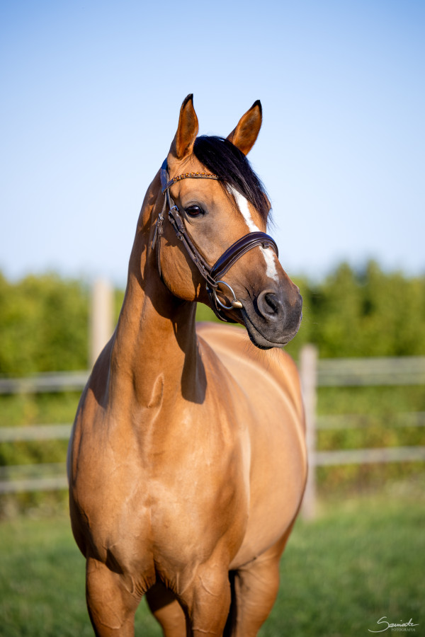 Oferuje na sprzedaż klacz w tym roku 13 lat o pięknej nietypowej maści. Niewyeksploatowana (od 3 lat w treningu od 0) z potencjałem. Doświadczona w konkursach L-N. Treningowo parkury do 130-135cm. Dobrze ujeżdżona wykonuje lotne zmiany nogi, łopatki, ustępowania, żucie z ręki. Nie boi się niczego na parkurze, zawsze po drugiej stronie, energiczna, idąca do przodu w parkurze.
