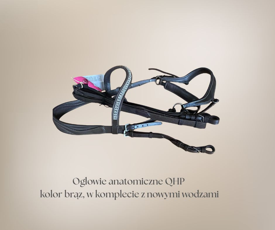 Ogłowie anatomiczne QHP z efektownym naczółkiem z kryształkami i lakierowanym nachrapnikiem. Piękny czekoladowobrązowy kolor. Ma szeroki wyprofilowany pasek potyliczny. Bardzo ładne i komfortowe dla wrażliwej głowy konia. Używane lecz nie zużyte, wygląda bardzo dobrze, brakuje dwóch malutkich kryształków, czego praktycznie nie widać. W komplecie nowe, nieodpakowane wodze.