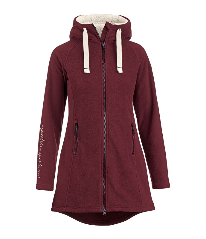 Przytulny, ciepły polarowy płaszcz z regulowanym kapturem, podszyty miękkim pluszowym futerkiem tylko w kapturze.. Dwukierunkowy zamek, 2 przednie kieszenie na zamek, naszywka z polaru i haft na rękawie