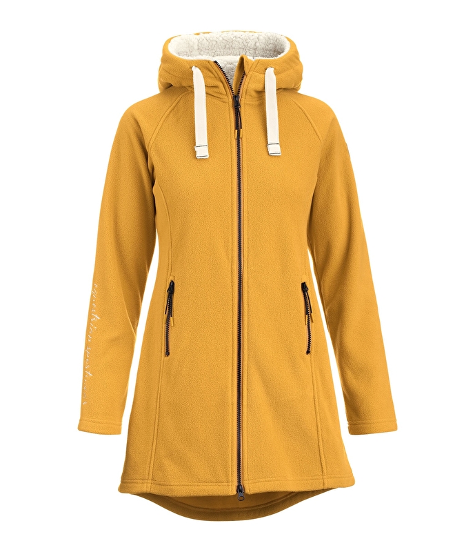 Przytulny, ciepły polarowy płaszcz z regulowanym kapturem, podszyty miękkim pluszowym futerkiem tylko w kapturze.. Dwukierunkowy zamek, 2 przednie kieszenie na zamek, naszywka z polaru i haft na rękawie