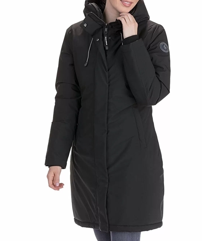 Długi, wyjątkowo ciepły zimowy płaszcz do jazdy konnej z bardzo wysokim kołnierzem i dużym, częściowo chowanym kapturem, który można regulować i zamocować z tyłu. Wodoodporność (5000 mm), wiatroodporność i oddychalność (5000 MVP). Wypełnienie z imitacji puchu, mankiety z gumką w pasie z prążkowanego materiału, 2 kryte kieszenie z przodu na suwak, kryty 2-kierunkowy zamek z przodu z ochroną podbródka, 1 rozcięcie z zamkiem błyskawicznym z tyłu i 1 otwarta kieszeń wewnętrzna. Podszewka z subtelnym wytłoczonym wzorem, na rękawie naszywka Felix Bühler. 100% poliestru.