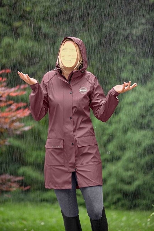 Długi płaszcz przeciwdeszczowy do jazdy konnej z podszewką w kontrastowym kolorze. Wodoodporny (5000 mm) i wiatroszczelny. Ukryty dwukierunkowy zamek błyskawiczny z przodu, 2 rozcięcia jeździeckie z zatrzaskami z tyłu, 2 kieszenie z klapką, regulowany kaptur i szerokość rękawów, ochrona podbródka, odblaskowe nadruki z przodu iz tyłu. 100% poliuretan.