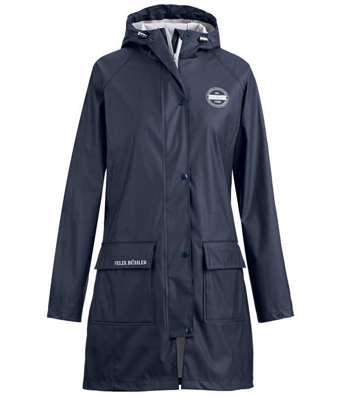 Długi płaszcz przeciwdeszczowy do jazdy konnej z podszewką w kontrastowym kolorze. Wodoodporny (5000 mm) i wiatroszczelny. Ukryty dwukierunkowy zamek błyskawiczny z przodu, 2 rozcięcia jeździeckie z zatrzaskami z tyłu, 2 kieszenie z klapką, regulowany kaptur i szerokość rękawów, ochrona podbródka, odblaskowe nadruki z przodu iz tyłu. 100% poliuretan.