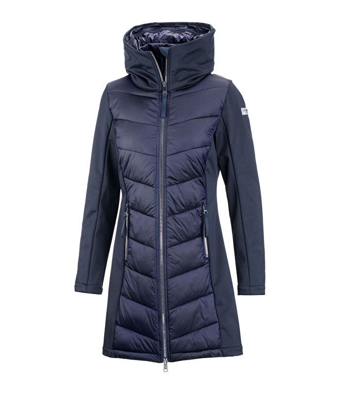 Podwójny kołnierz i pikowany kaptur w dużym zewnętrznym kołnierzu zapinanym na zamek. Z tyłu 2 rozcięcia jeździeckie zapinane na zamek, podszyty dwukierunkowy zamek błyskawiczny z osłoną podbródka, 2 kieszenie z przodu zapinane na zamek, błyszczący haft pod kołnierzykiem i urocza taśma Felixa Bühlera z metalowym sercem na rękawie. Przód, tył, wewnętrzny kołnierz i kaptur 100% nylon, obszar softshell 92% poliester, 8% elastan.
