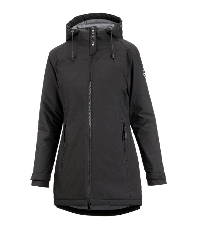 Funkcjonalny płaszcz do jazdy konnej z ciepłym pikowaniem z imitacji puchu i kapturem. Wodoodporny (8000 mm), wiatroszczelny i oddychający. Podszyty dwukierunkowy zamek błyskawiczny z przodu, 2 kieszenie z przodu zapinane na zamek, regulowana szerokość rękawów, wysoki kołnierz z regulowanym, pikowanym kapturem, który można przymocować z tyłu. Z tyłu 2 rozcięcia jeździeckie zapinane na zamek, naszywka Felix Bühler na rękawie i odblaskowy nadruk Felix Bühler na kołnierzu. 100% poliester.