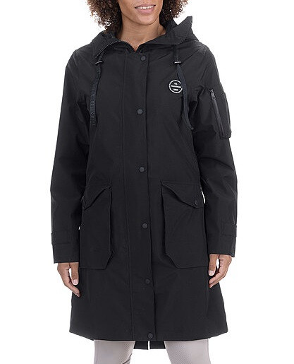 Stylowy, funkcjonalny płaszcz jeździecki z wysokim kołnierzem, dużym, regulowanym kapturem zapinanym z tyłu.