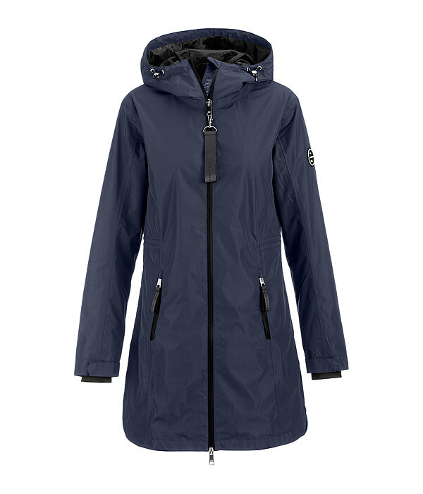 Supermodny płaszcz jeździecki wykonany z funkcjonalnego, wysokiej jakości materiału. Wodoodporny (5000 mm), wiatroszczelny i oddychający (5000 MVP). Wodoodporny, podszyty dwukierunkowy zamek błyskawiczny z osłoną podbródka, 2 wodoodporne kieszenie z przodu zapinane na zamek oraz regulowany pas. W całości podszyta oddychającą siateczką, posiada duży, regulowany kaptur z możliwością zapięcia z tyłu. Regulowane mankiety z elastycznymi plisami przeciwwiatrowymi. Dwa długie, zapinane na zamek otwory wentylacyjne z tyłu zapewniają optymalną swobodę ruchów podczas jazdy.