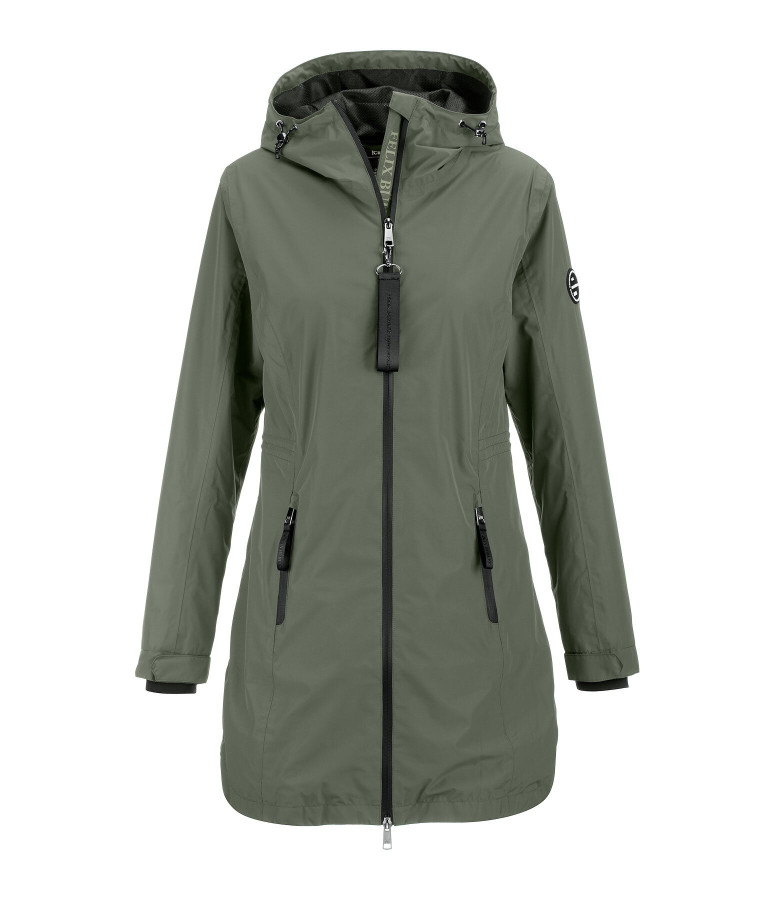 Supermodny płaszcz jeździecki wykonany z funkcjonalnego, wysokiej jakości materiału. Wodoodporny (5000 mm), wiatroszczelny i oddychający (5000 MVP). Wodoodporny, podszyty dwukierunkowy zamek błyskawiczny z osłoną podbródka, 2 wodoodporne kieszenie z przodu zapinane na zamek oraz regulowany pas. W całości podszyta oddychającą siateczką, posiada duży, regulowany kaptur z możliwością zapięcia z tyłu. Regulowane mankiety z elastycznymi plisami przeciwwiatrowymi. Dwa długie, zapinane na zamek otwory wentylacyjne z tyłu zapewniają optymalną swobodę ruchów podczas jazdy.