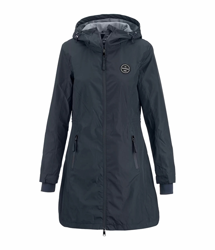 Wysoce funkcjonalny, lekki płaszcz jeździecki wykonany z super wygodnego i wysokiej jakości materiału. Wodoodporny (5 000 mm), wiatroszczelny i oddychający (5 000 MVP). Wodoodporny, podszyty dwukierunkowy zamek z przodu, 2 wodoodporne kieszenie na suwak z przodu, regulowana talia. W całości podszyty oddychającą siateczką, duży, regulowany kaptur, który można zapiąć z tyłu. Regulowane mankiety z elastyczną osłoną przeciwwiatrową. 2 długie rozcięcia do jazdy na plecach z zatrzaskami zapewniają optymalną swobodę ruchów podczas jazdy. Odznaka Felixa Bühlera na piersi. Materiały: 100% poliester.