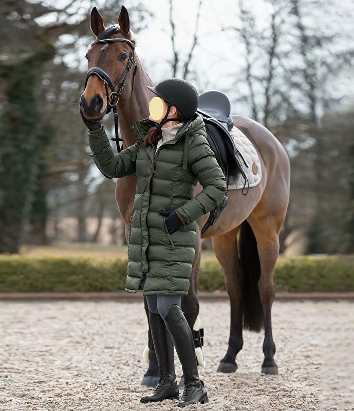 Niezwykle ciepły, długi i super nowoczesny płaszcz jeździecki! Miękka wyściółka z imitacji puchu, bardzo wysoki, regulowany, a także ocieplany kaptur, który można przymocować z tyłu. Ukryty dwukierunkowy zamek błyskawiczny z przodu, 2 ukryte kieszenie na zamek z przodu wyłożone miękkim polarem. Wiatroszczelna i wyjątkowo ciepła. Mankiety wykonane z miękkiego, prążkowanego materiału i długi, wyściełany rozporek do jazdy z zamkiem błyskawicznym z tyłu. Wysokiej jakości haft Felix Bühler na rękawie.