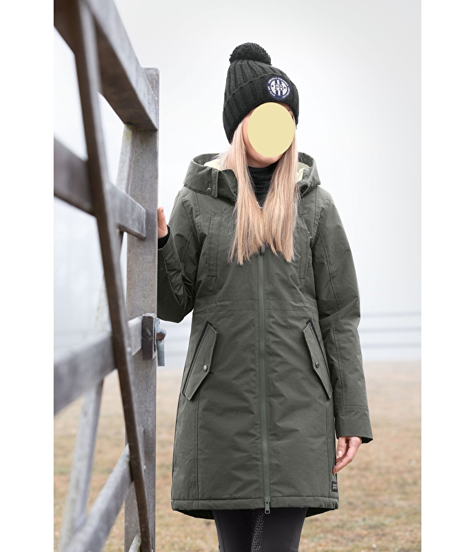 Elegancka, funkcjonalna parka jeździecka, zapewniająca komfort. Wewnątrz ciepłe pikowanie z imitacji puchu i częściowo miękka podszewka z pluszowego polaru. Wodoodporny (5000 mm), wiatroszczelny i oddychający. Kaptur jest regulowany, również podszyty miękkim pluszowym polarem i można go powiększyć za pomocą zatrzasków lub w razie potrzeby dopiąć z tyłu. Podszyty dwukierunkowy zamek błyskawiczny z przodu, 2 kieszenie na piersi zapinane na zamek i 2 kieszenie z klapką z przodu, regulowana szerokość talii i rękawów oraz elastyczne mankiety. Długie rozcięcie jeździeckie z zamkiem z tyłu, naszywka Felixa Bühlera na rękawie. 72% bawełna, 28% poliamid.