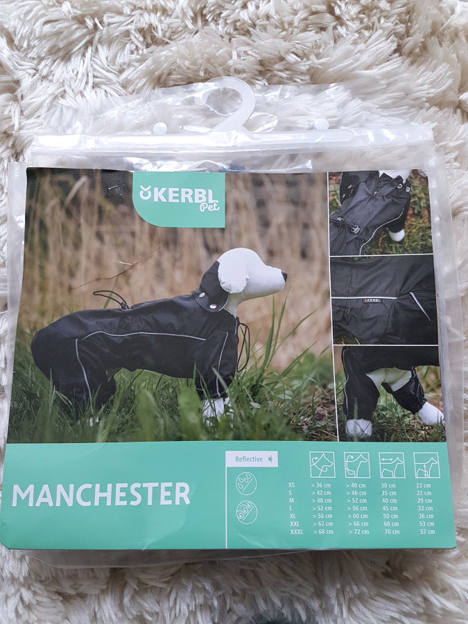 Kombinezon przeciwdeszczowy dla psa marki Kerbl, zapinany na grzbiecie na suwak, z odpinanym kołnierzem, ściągaczami na szyi, brzuchu i łapach, odblaskowymi paskami. Nowy, jedynie przymierzony, podniszczone opakowanie.
