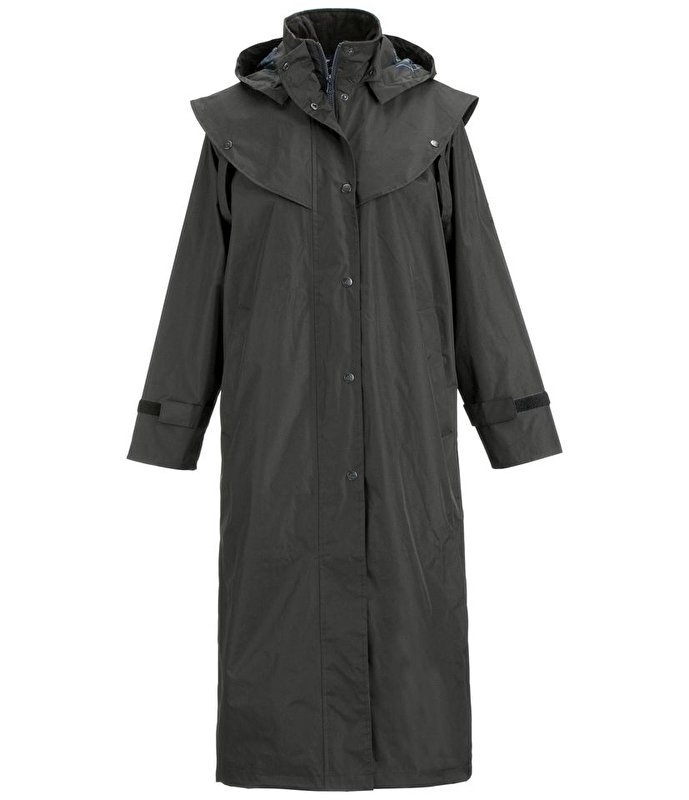 Solidny płaszcz do jazdy konnej i pracy w obrzeżach stajni. Z peleryną na ramieniu, bez kaptura. Posiada nogawki do mocowania, regulowane paskami na rzep. 2-drożny suwak z plisowanym zapięciem na guzik i wieloma zewnętrznymi kieszeniami. Oddychający, wodoodporny i odporny na wiatr. Powłoka zewnętrzna 100% poliester, materiał wewnętrzny 100% bawełna.
