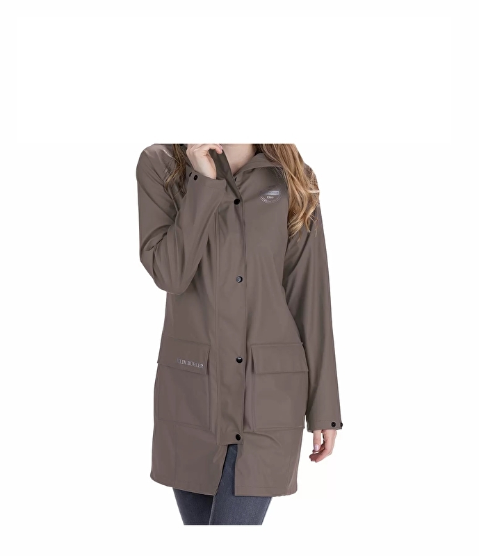 Długi płaszcz przeciwdeszczowy do jazdy konnej z podszewką w kontrastowym kolorze. Wodoodporny (5000 mm) i wiatroszczelny. Ukryty dwukierunkowy zamek błyskawiczny z przodu, 2 rozcięcia jeździeckie z zatrzaskami z tyłu, 2 kieszenie z klapką, regulowany kaptur i szerokość rękawów, ochrona podbródka, odblaskowe nadruki z przodu i z tyłu. 100% poliuretan.