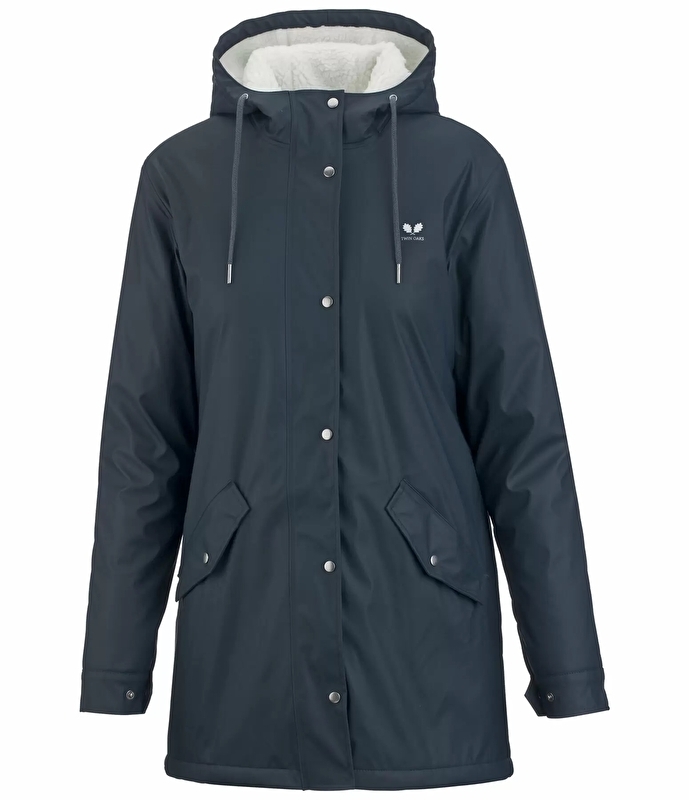 Długi płaszcz przeciwdeszczowy do jazdy konnej z ciepłą podszewką z pluszowego polaru. Wodoodporny (5 000 mm) i wiatroszczelny. Ukryty dwukierunkowy zamek błyskawiczny z przodu, rozcięcie do jazdy konnej z zatrzaskami z tyłu, 2 kieszenie z patkami, regulowany kaptur i szerokość rękawów. 100% poliuretan. Podszewka 100% poliester.