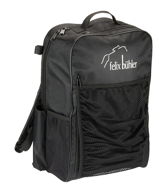Wyrafinowany plecak jeździecki wykonany z wytrzymałego nylonu z zewnętrzną komorą na kask, w której można bezpiecznie i szybko schować kask jeździecki. Oprócz dwóch elastycznych kieszeni bocznych, w których z łatwością można przechowywać butelki z wodą lub produkty do pielęgnacji, na górze znajduje się miękko wyściełana przegroda na smartfon. Z przodu wyściełana kieszeń zapinana na rzep, zapewniająca dużo miejsca do przechowywania. Pomiędzy nimi można zmieścić buty jeździeckie o całkowitej wysokości do 50 cm. Oprócz miękko wyściełanych pasków naramiennych o regulowanej długości, plecak jeździecki posiada uchwyt do przenoszenia. Wymiary rozmiaru L: 35 x 52 x 17 cm.