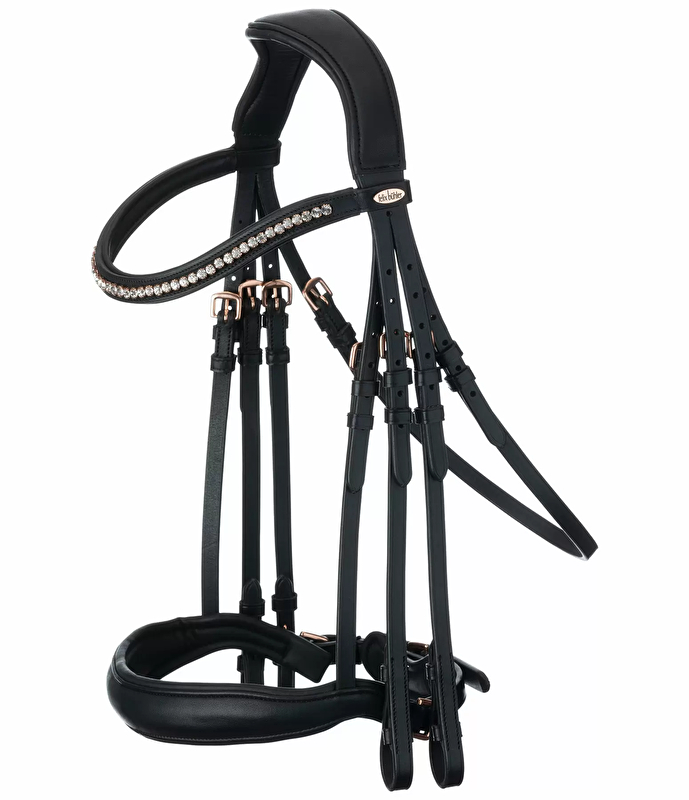 Podwójne ogłowie wykonane z wysokiej jakości olejowanej skóry premium z anatomicznym szwedzkim nachrapnikiem, który dzięki swojemu krojowi oferuje więcej miejsca na podwójne wędzidło. Paski na szyję i nos wykonane są w całości z miękkiej skóry. Ta misternie przetworzona skóra jest szczególnie miękka i przyjemna w dotyku oraz zapewnia optymalny rozkład nacisku i odciążenie w okolicy uszu, pierwszego kręgu szyjnego i nasady nosa. Miękko wyściełany podbródek, naczółek w kształcie sowy z efektownymi białymi kryształkami. Podwójne uzdy i wędzidła sowa, podwójne wodze uzdy są wyposażone w ukryte, wewnętrzne haczyki uzdy. Skórzana tapicerka w kolorze białym S i czarnym SR. Okucia dla koloru S srebrny i dla SR różowe złoto. łącznie z kompletnymi skórzanymi wodzami podwójnymi, bez wędzideł.