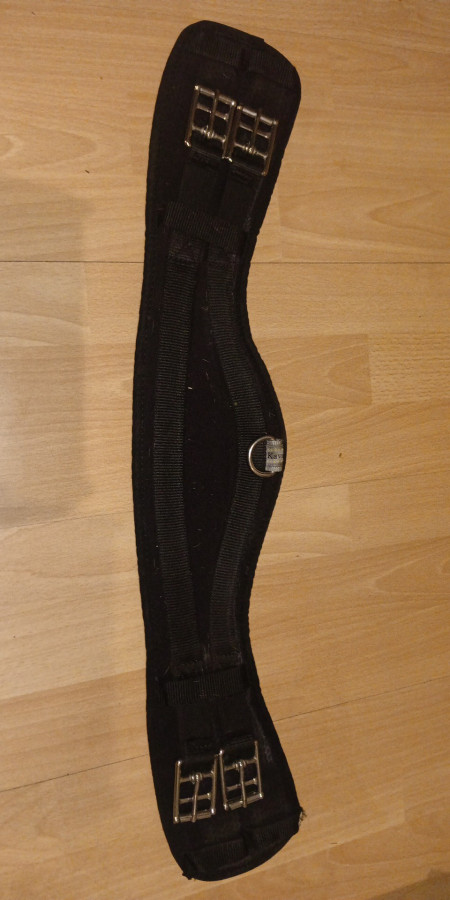 Popręg Kavalkade Klimatex Moon, opisany przez producenta jako półksiężyc, wypada bardziej na anatomiczny, ma gumy z dwóch stron. Jest wyprany, ale zostało na nim trochę sierści. Ma małą wadę - lekko wyprutą szlufkę do przystuły, ale nie wpływało to na użytkowanie, nic się dalej nie pruło, z pewnością da się to łatwo zszyć.