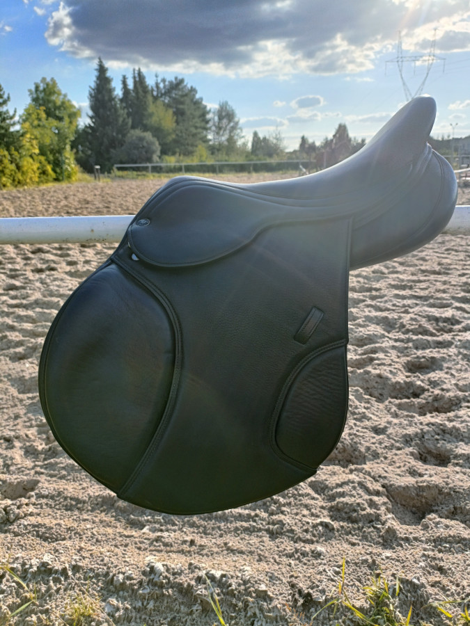 Oferuję siodło skokowe w bardzo dobrym stanie, używane zaledwie kilka miesięcy. Rozmiar siedziska 17'', łęk 33 (polskie M). Wykonane z czarnej, miękkiej skóry, z czarną lamówką i prostą szlufką bez kryształków. Wypełnienie stanowi naturalna wełna.