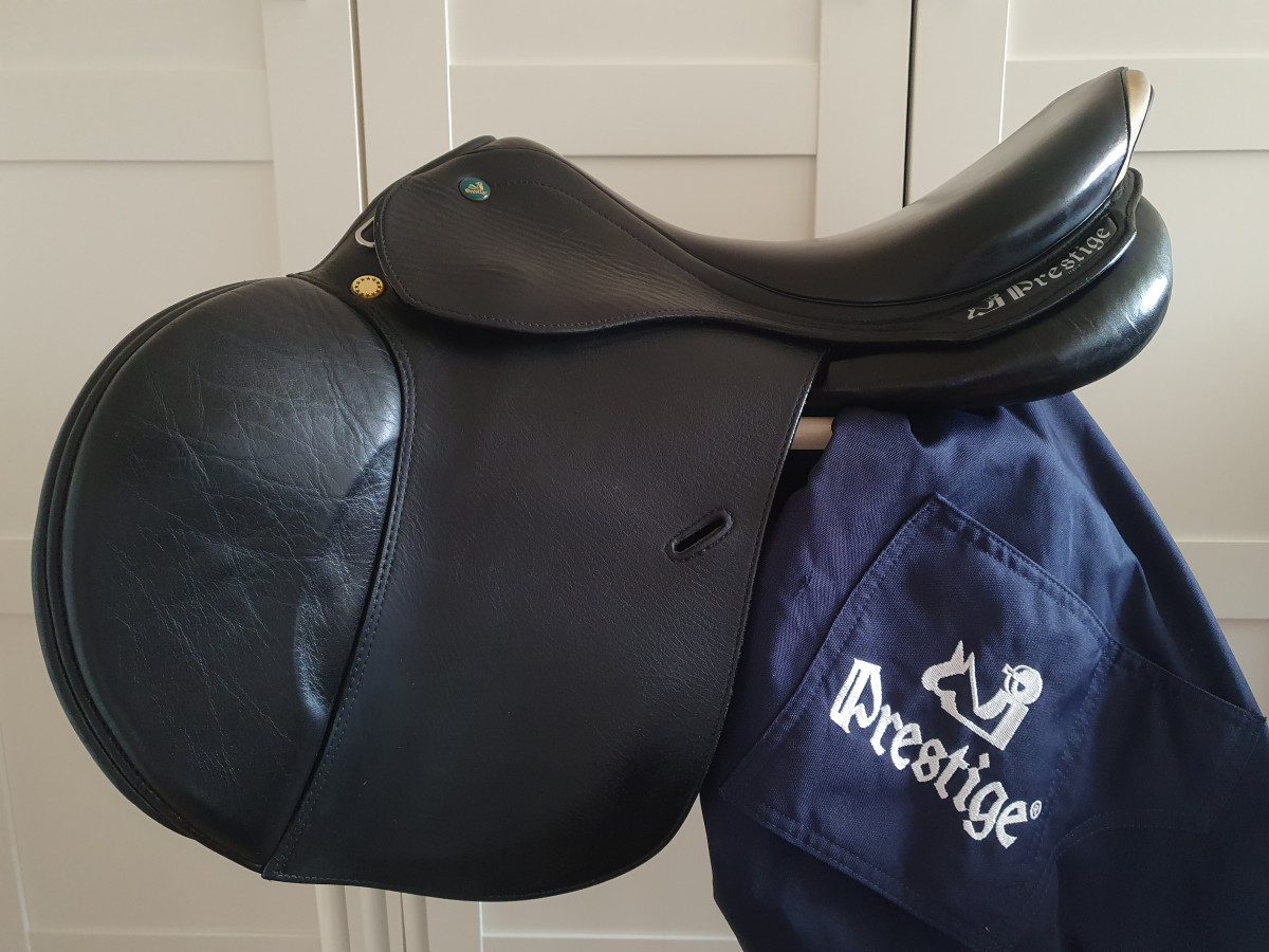 Na sprzedaż czarne siodło skokowe włoskiej firmy PrestigeItalia, model Elastic Professional, wersja D - tybinki z dodatkową warstwą cielęcej skóry.