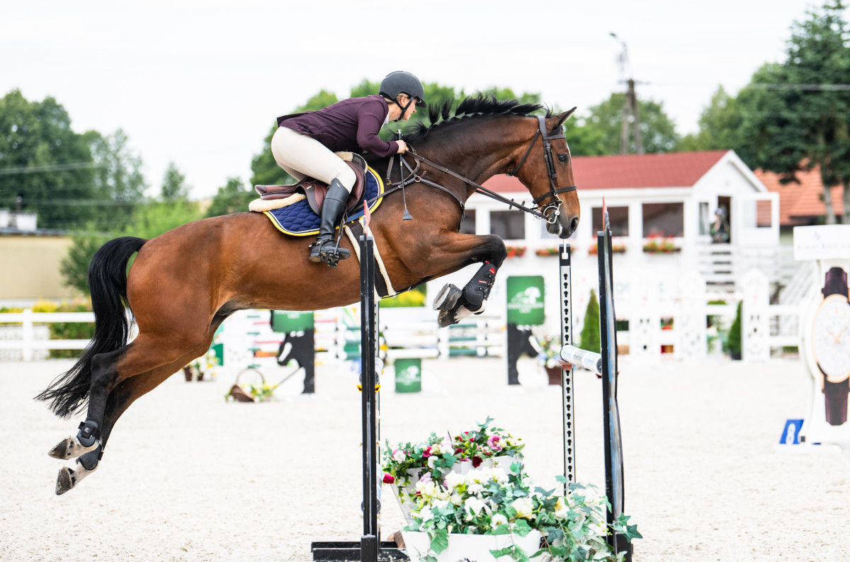 Skacze spokojnie i równo parkury 130 cm na zawodach.
